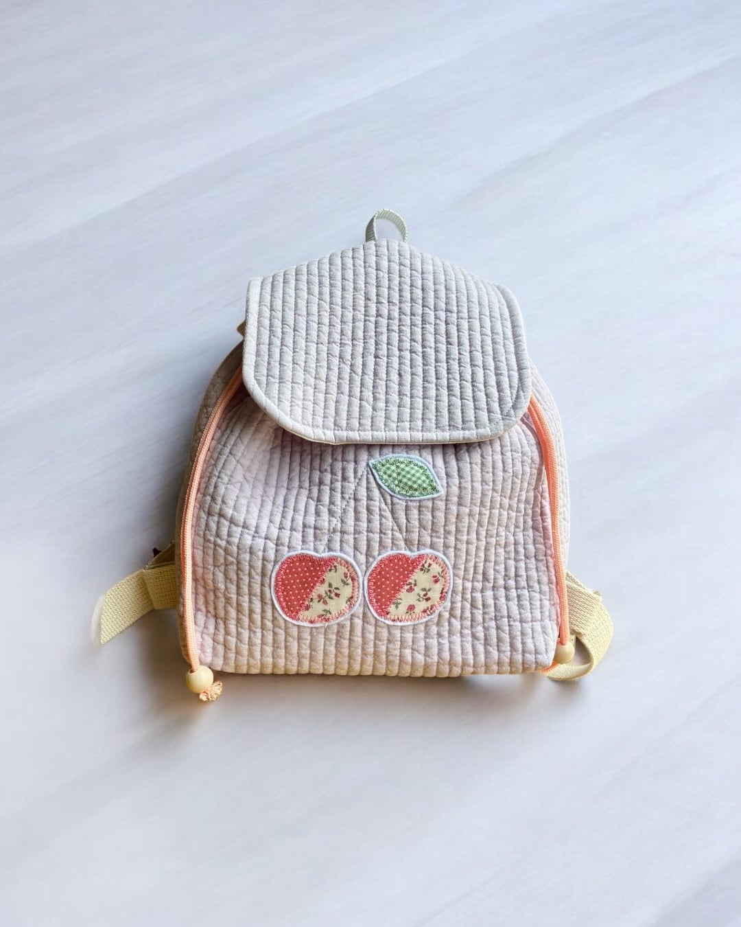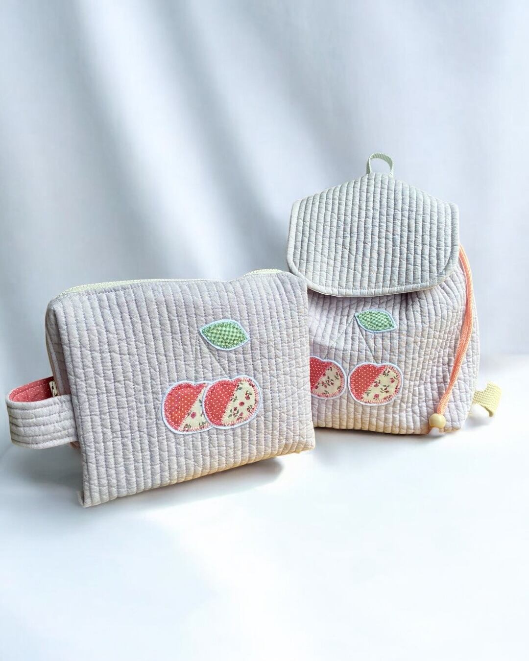 アップリケがアクセント! デイリーも、おでかけも幅広く活躍♡ お揃いさくらんぼアップリケのおむつがぴったりマルチポーチも販売中!ポーチはリュックにピッタリはいるサイズです(写真5枚目参照)